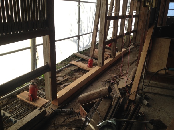 まずは、ジャッキで柱を上げてみる。色々と試行錯誤しつつ、なんとか柱を持ち上げる。