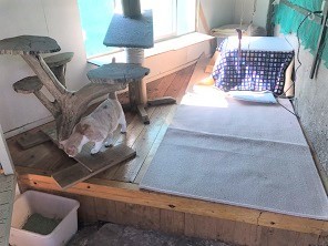 そしてこちらは、倉庫の一部を改装して作った小部屋です。怖がりで、他の動物たちと一緒にいるのがストレスになりそうな猫の兄弟を保護した時に、小さな部屋を作りました。ここで静かに過ごしてもらいます。