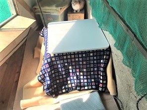 ですがこの部屋は外と壁1枚。明け方など特に寒いと思いますので、カーペットだけでなくこたつもセットします。