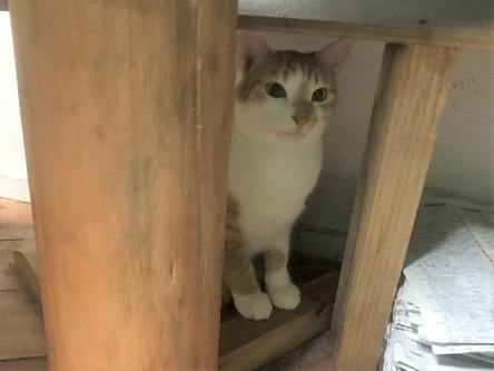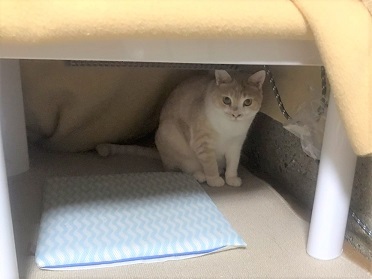 元々野良猫で、怖がり。こたつなんて見たこともないものが入ってきたら、ぴゅーっと柱の上に逃げてしまう・・・