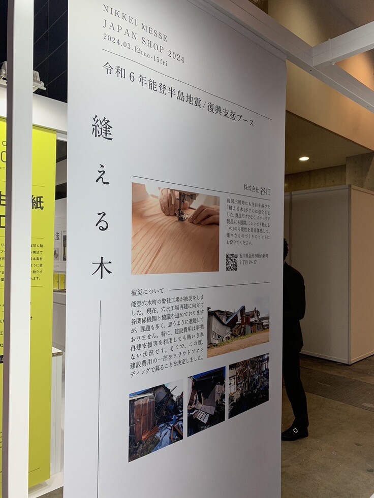 この度、弊社の縫える木で製作した商品を展示し、多くの方々に弊社を知って頂くことが出来ました。また、被災状況が分かるパネルを設置していただき、その現実を伝えることができたことに感謝申し上げます。