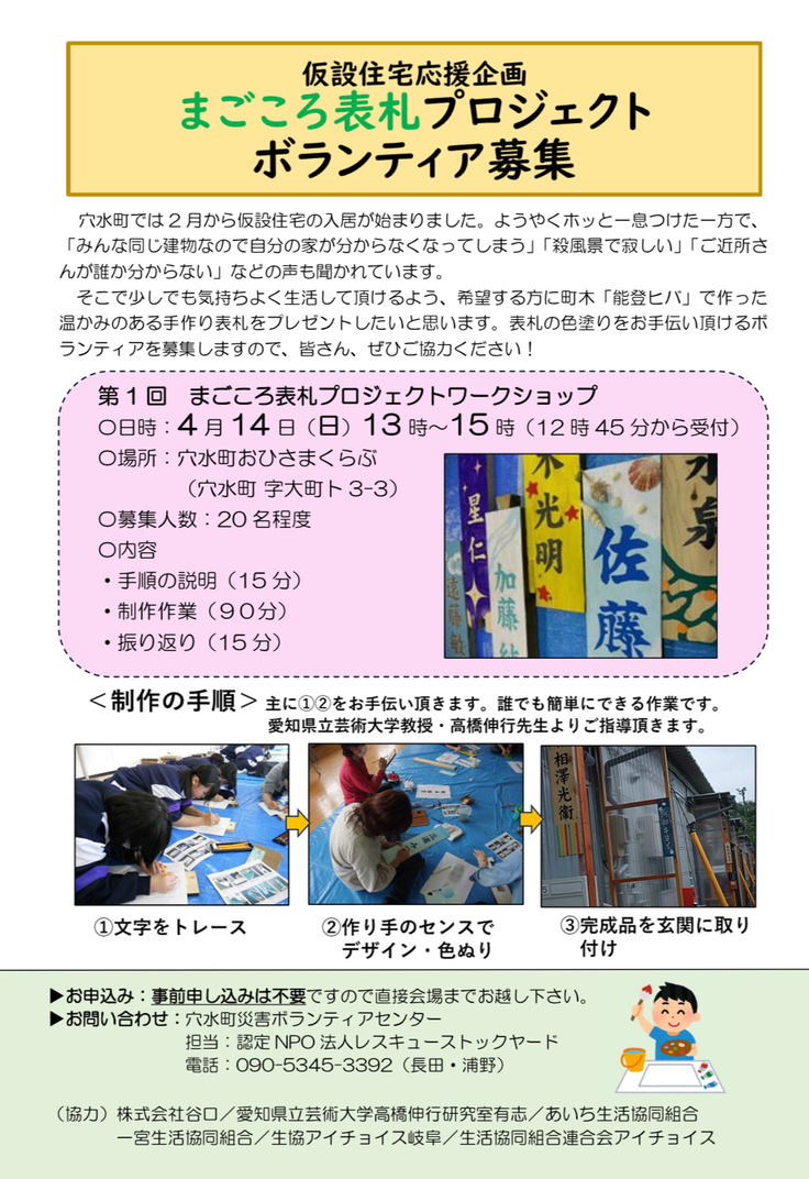 また、表札につきましては、色塗りなどのワークショップを行い、仮設住宅の入居者様へお渡しする予定だそうです。