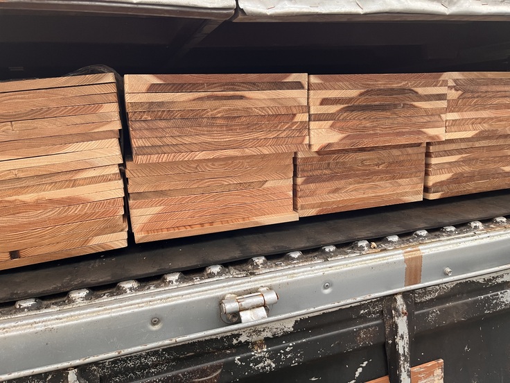 川北町から穴水町に、仮設住宅用の杉の棚板を運んでおります。