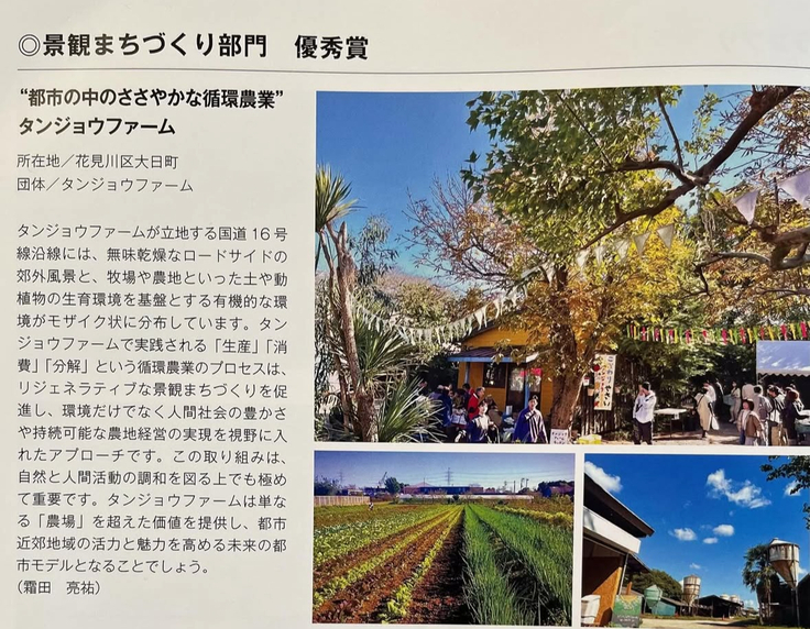以前の投稿でもお伝えいたしましたが、私達「タンジョウファーム」は「景観まちづくり部門」において「都市の中のささやかな循環農業」と言うタイトルで優秀賞を受賞いたしました。