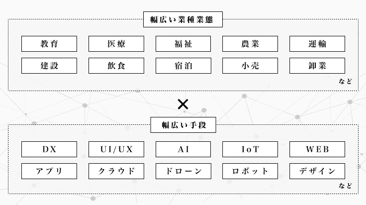 「地方に進化を、世界に革新を」というビジョンの下、建設・教育・医療・福祉・農業・運輸・飲食・宿泊・小売といった幅広い業種業態の戦略立案からプロジェクトチーム組成、新規事業開発、デジタルプロダクト開発、スタートアップ立ち上げ支援までワンストップでサービスを提供し、地元企業と共に成長してきました。