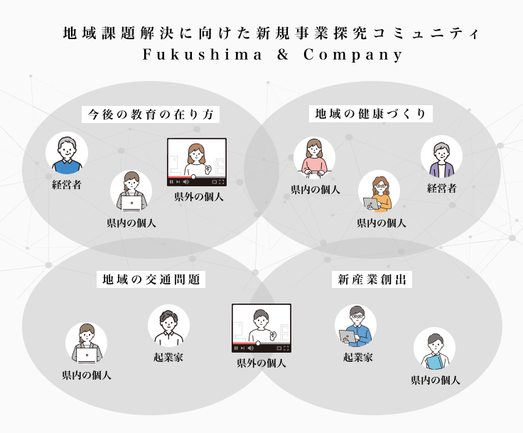 具体的には、地域課題解決に向けた新規事業探究コミュニティとして「Fukushima & Company」を設立します。福島に存在するリアルな問題と向きあい、答えのない問いに対して挑戦する経営者や起業家を中心にしたコミュニティを組成し、福島県内外の個人や団体が探究プロセスを共有することで、共に学び、新しいアイディアを共創する体験を提供します。