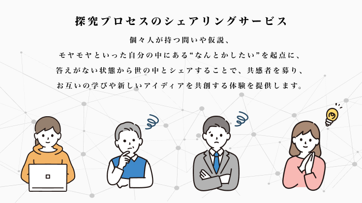 個々人が持つ問いや仮説、モヤモヤといった自分の中にある“なんとかしたい”を起点に、答えがない状態から世の中とシェアすることで、共感者を募り、お互いの学びや新しいアイディアを共創する体験を提供します。