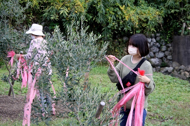 昨年3月に植えた12本のオリーブのうち一本だけが今年に入り弱りはじめ、元気をを取り戻せと見守ってきましたが、他の木のようになれず植え替えることに。そして畑に時々現れて土を掘り返し、ミミズなどを食べるイノシシ除けのリボンをきのえだに結び付ける作業をしました。