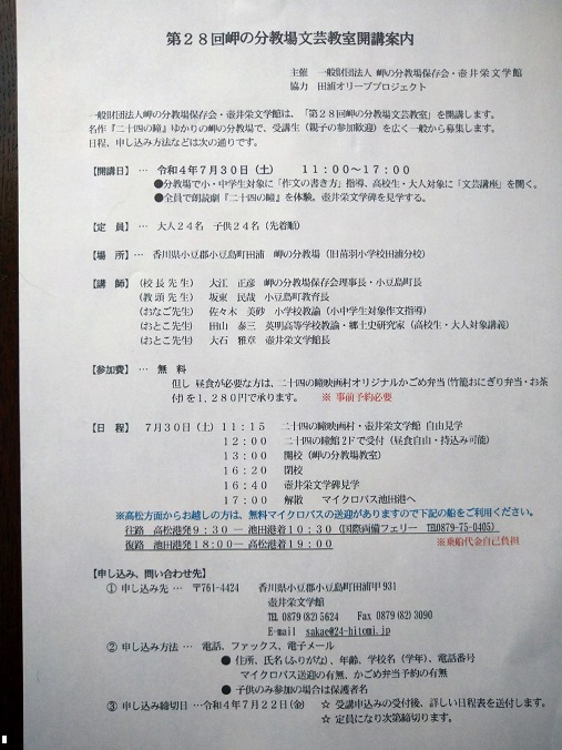 一般財団法人岬の分教場保存会・壺井栄文学館主催の「岬の分教場文芸教室」が開講されます。今回私たち田浦オリーブプロジェクトも協力参加をすることになりました。田浦分教場は現在学校としては使われていませんが、教育に関する様々な催しに利用されています。文芸教室もこの校舎で小さな机、椅子を使って勉強します。