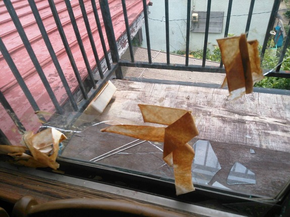 (二階の割れたガラス、腐っているベランダ。現在は子ども達を近寄らせないように部屋に鍵がかかっています)