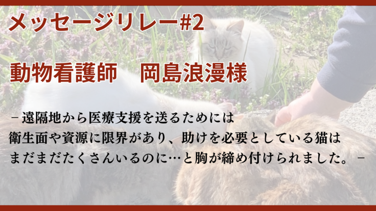 メッセージ#2 動物看護師 岡島浪漫様「助けを必要としている猫はまだまだたくさんいるのに…」