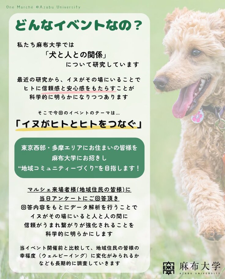 本イベントは、文部科学省・日本学術振興会の「科学研究費助成事業」の助成を受けており、ヒト-イヌ-地域の一体化をテーマに、地域のつながりやウェルビーイングの向上を科学的に研究する目的で開催されます。会場では、学生によるアンケート調査も実施されますので、ご協力をお願いいたします!