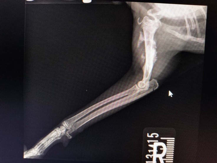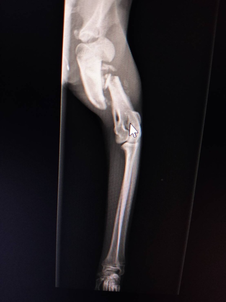 骨折した状態で市に収容されていましたが、院長が相談を受け、当団体で引き取ることになりました。