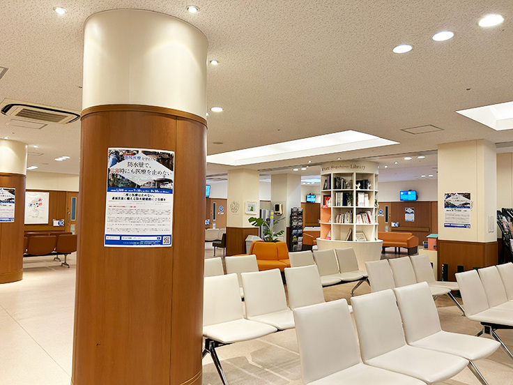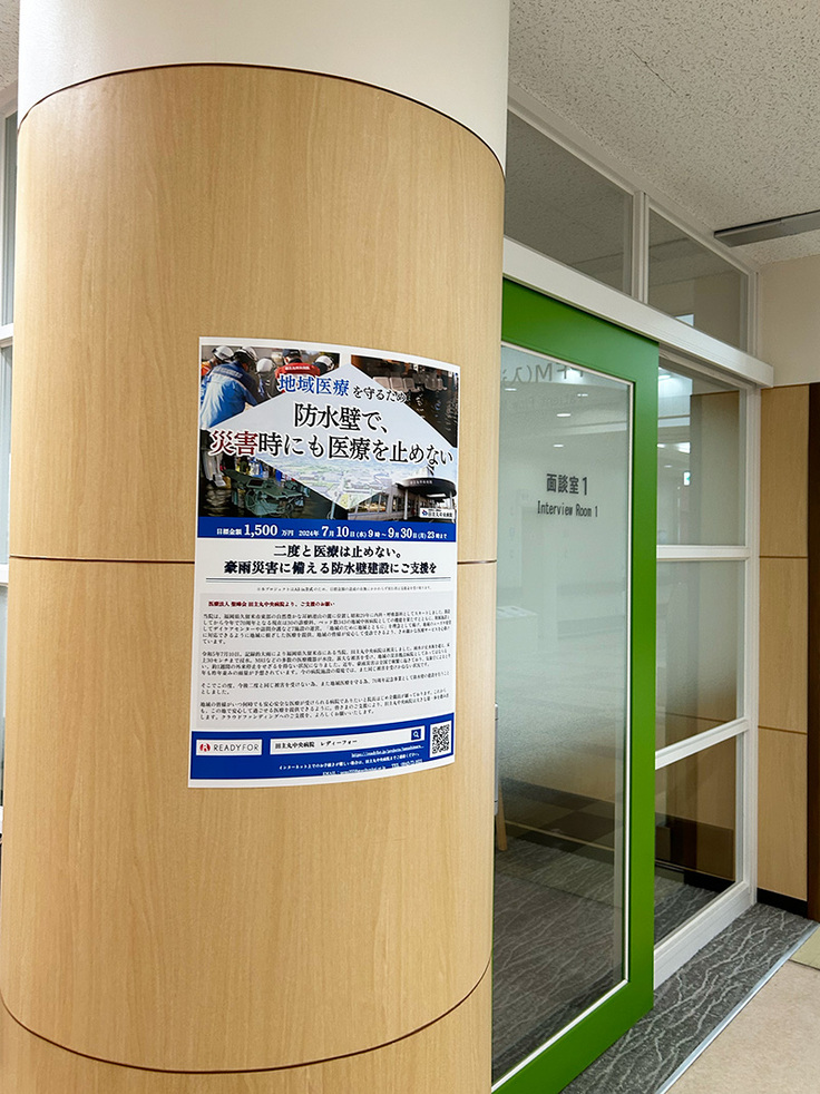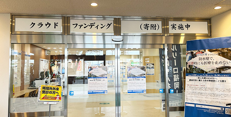 正面玄関には看板を設置し、待合室の柱や壁にはポスターを掲示しています。