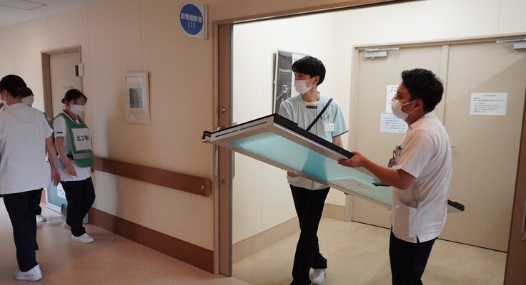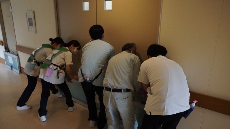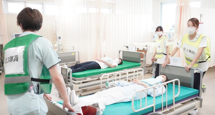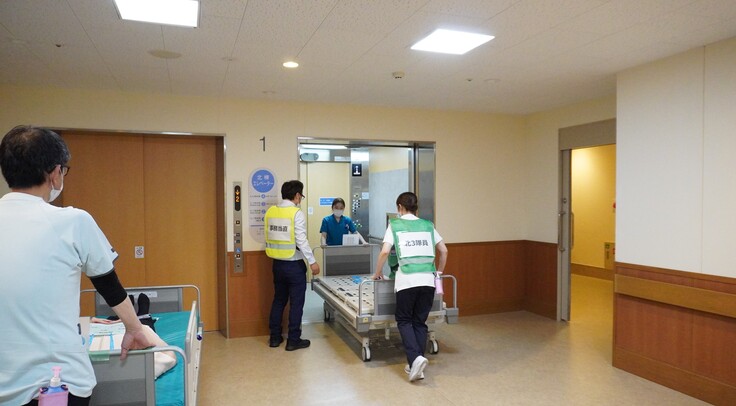 訓練後半は北1階病棟にて患者さまの垂直避難訓練を行いました。職員が模擬患者となり、ケースごとの対応を確認。職員それぞれが声を掛け合い協力し、避難を完了させました。