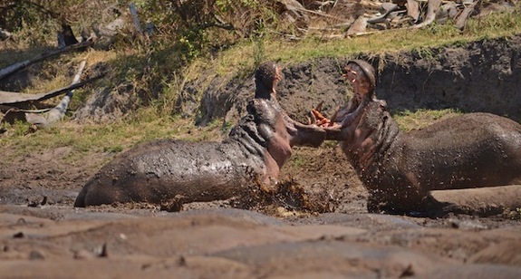 遠くで水しぶきが上がったと思ったら、2頭のカバは激しく争いながら、