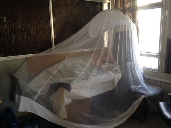 マラリアになってはどうしようもないので、机の上に蚊帳は釣って泊まり込みです。こんな感じ。