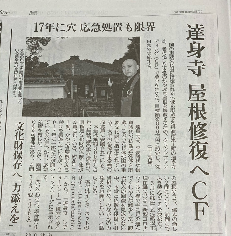 本日の読売新聞で掲載されました。現在55%達成しています。今後も茅葺屋根の修繕ができるよう、多くのご支援をよろしくお願いいたします。