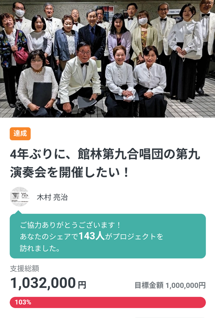 本日、館林第九合唱団にとって初めてのクラウドファンディングが終了します。皆様のおかげで目標金額に到達致しました(泣)