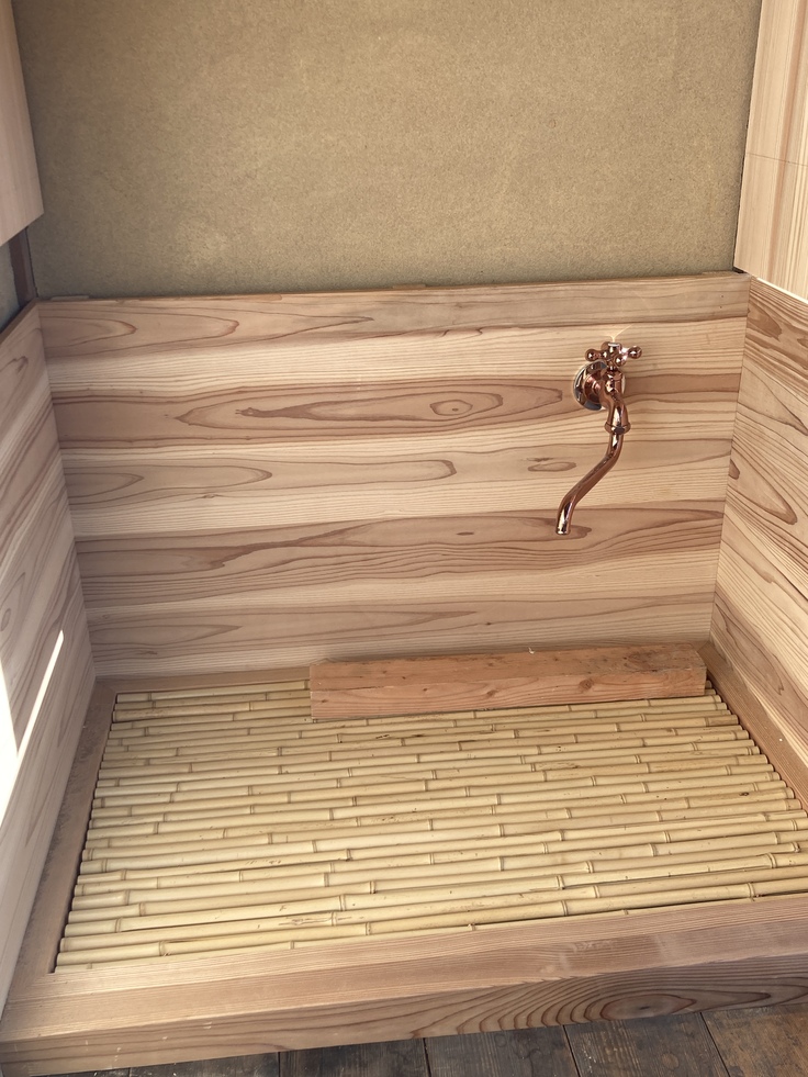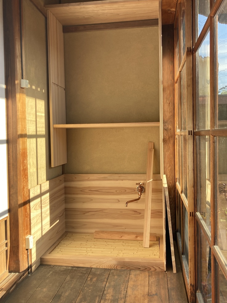 完成間近の水屋(廊下が傾斜しているため縁の厚みが違います)