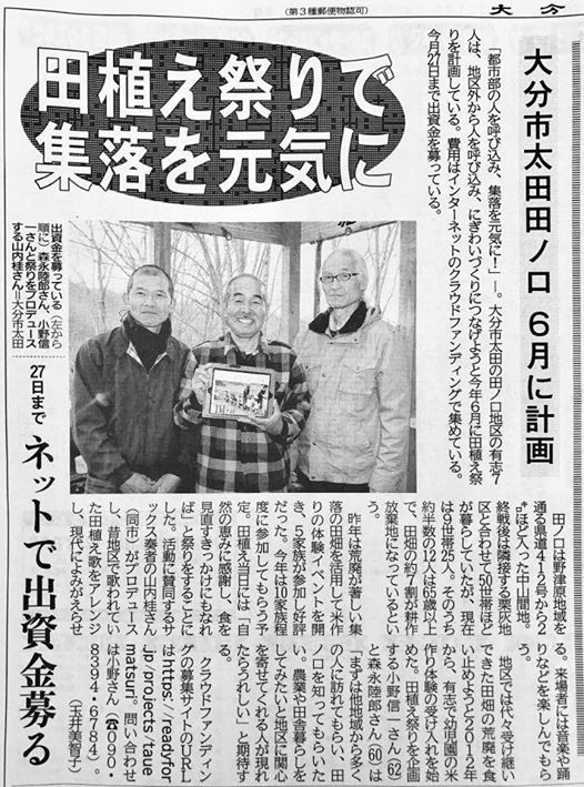 大分市野津原の山奥、田ノ口を元気にしようとする取り組みが新聞に載りました。