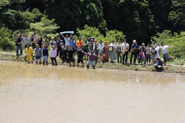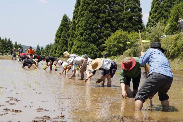 田んぼに集まった人たちは、それに合わせて田植えをしました。
