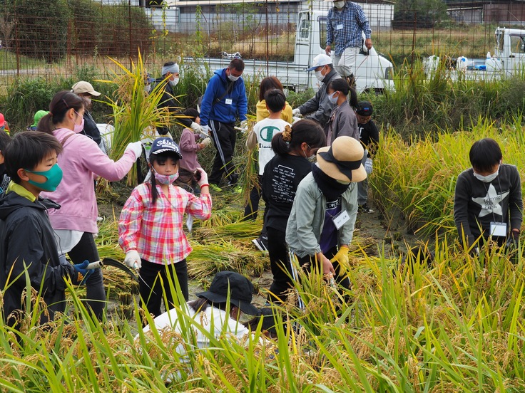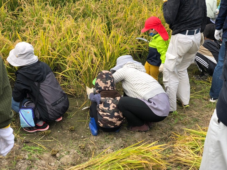 当日は有機無農薬米を生産する農家さん指導の下、鎌を使った稲の手刈り・はぜ干し体験をしてから、みんなでお昼ごはんを食べました。