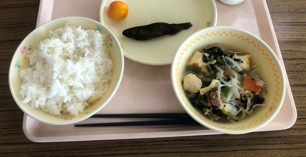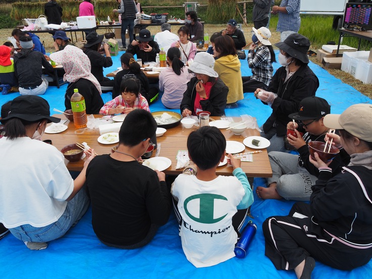 ↑作業の後は、お待ちかねのお昼ごはん!有機無農薬米の炊き立てご飯と、地元の方が用意してくれた猪汁を堪能しました。