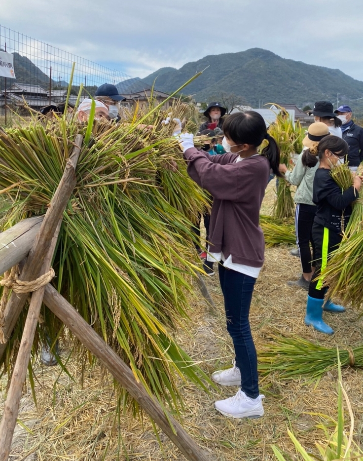 ↑稲刈りの後は、農家さんに教わりながらのはざかけ作業です。