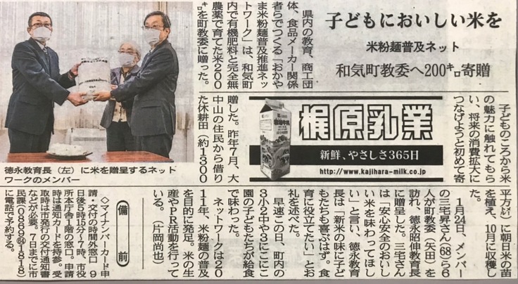 昨年は、「朝日」という岡山県のみで栽培されているお米200㎏を和気町教育委員会へ寄贈し、今年1月24日に岡山県和郡和気町の幼・小・中学校の給食で提供していただきました!