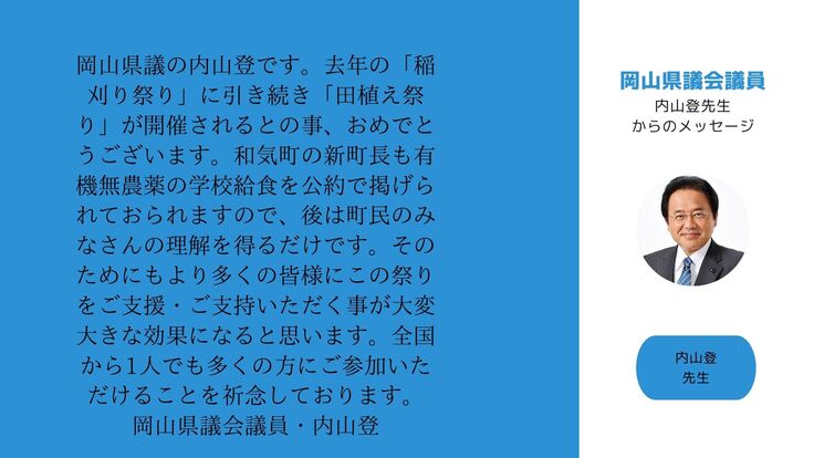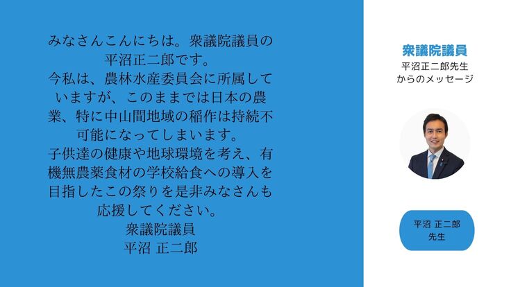 体験型の田んぼのお祭りを通して、お米の大切さ、食と農の繋がり、日本の心を感じてもらい、学校給食への有機無農薬米の導入へとつながるように努めてまいりたいと思います。