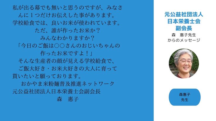 このネットワークには、岡山県の米農家さんや製麺業者だけではなく、学校関係者や、栄養士、各界の経営者といった産官学の総勢22名の多分野にわたるエキスパートが協力し合って、お米の消費促進のために活動しています。