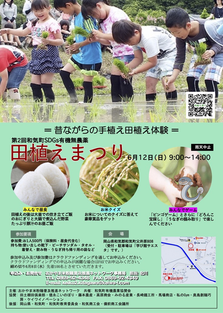 そこで今年は規模を拡大し、6月12日(日)に田植え祭り(第二回和気町SDGs有機無農薬田植え祭り2022)を開催します!