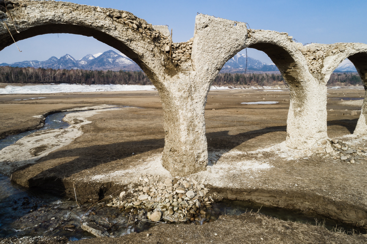 水力発電に使われる糠平湖では水位の上下が大きく、年間を通じて30メートルほど変動します。その湖底に立つタウシュベツ川橋梁は、1年の間に水没と出現とを繰り返しながら、すでに60年以上を経てきました。