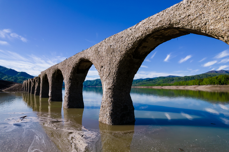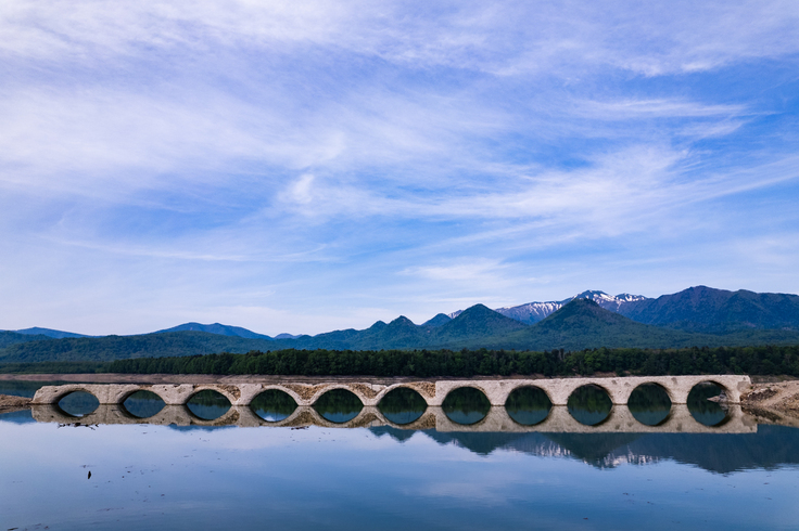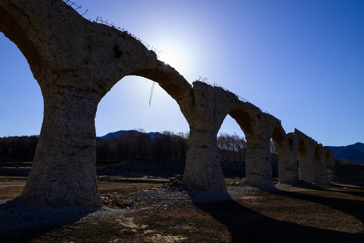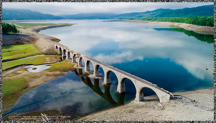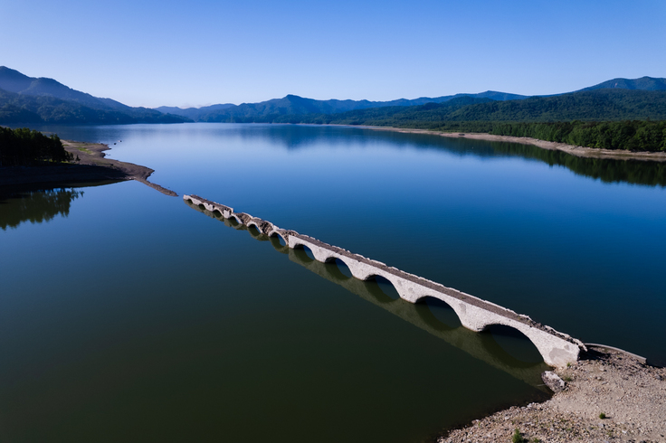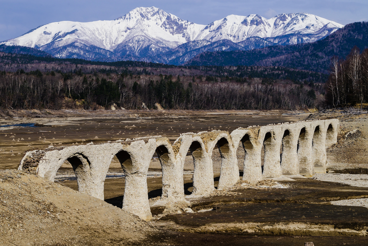 タウシュベツ川橋梁は北海道大雪山国立公園の糠平湖畔に残るコンクリートアーチ橋です。1937(昭和12)年に旧国鉄士幌線に架かる鉄道橋として建設されました。当時は深い森に包まれていた場所ですが、1955(昭和30)年に水力発電用の糠平ダムが造れたのにともない水没。橋の上に敷かれていたレールは撤去されたものの、橋自体は現地にそのまま取り残され、以来半世紀以上のあいだ、糠平湖の水位増減とともに水没と出現とを毎年繰り返してきました。