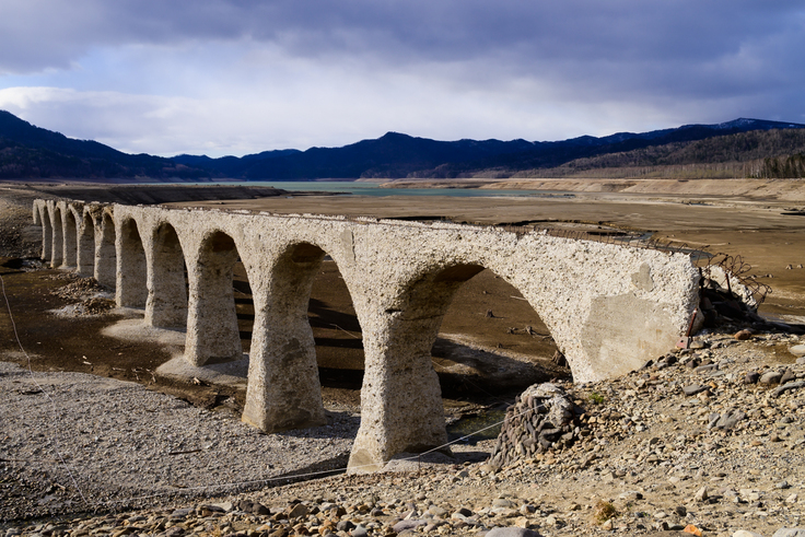 タウシュベツ川橋梁があるのは、冬の寒さで知られる北海道の中でも厳寒の土地。最低気温が氷点下20度を下回ることも珍しくありません。氷雪に削られるコンクリートの強度は年々もろくなり、近年では崩落も間近と言われています。