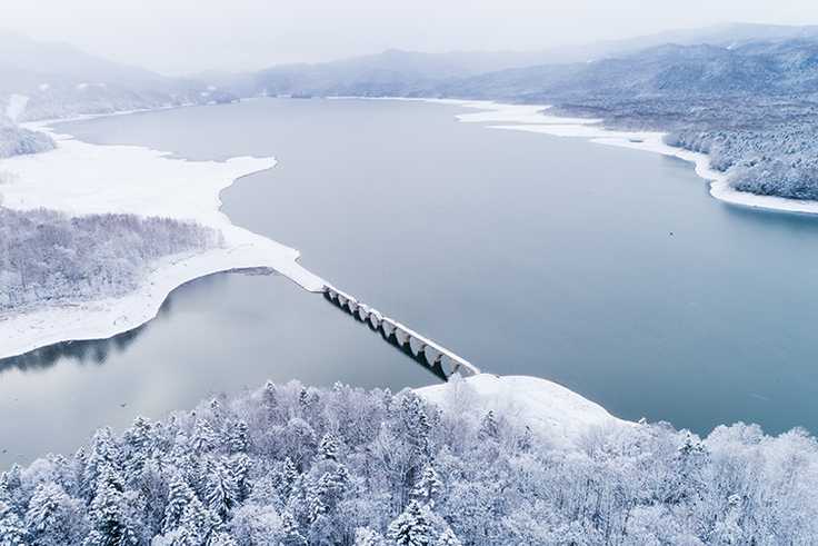 <冬>雪に包まれた森と水面に映えるタウシュベツ川橋梁