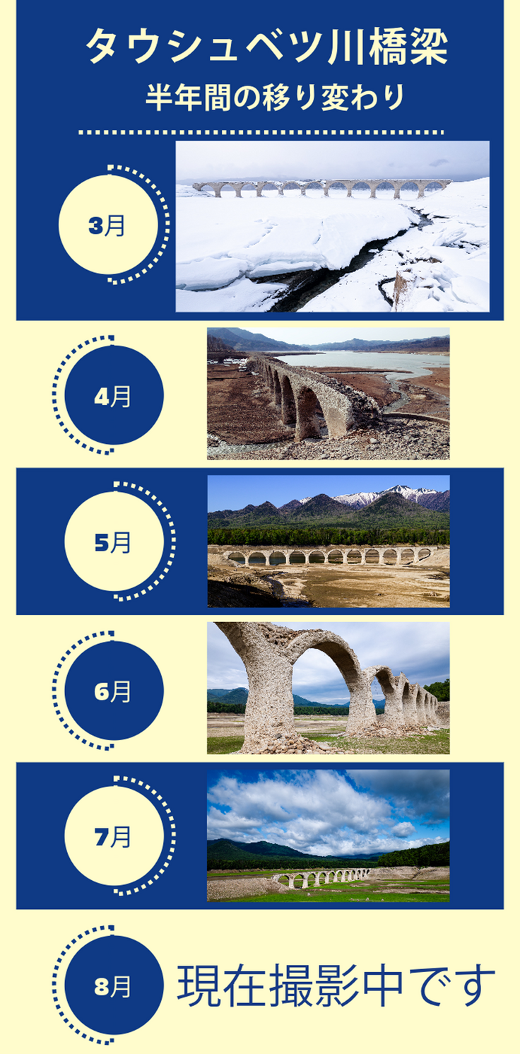 まだ氷雪が残る3月から、湖底が緑に覆われる8月まで。同じ場所、同じアングルでも、タウシュベツ川橋梁を取り巻く光景は半年間で大きく変わります。