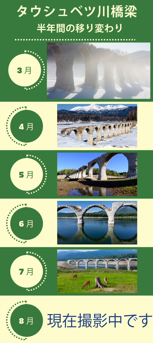 『続 タウシュベツ川橋梁』の制作にあたっては、『タウシュベツ日誌』シリーズの存在が欠かせませんでした。日々タウシュベツ川橋梁に通い、撮りためた膨大な写真群から選りすぐった写真。半年に一度の『タウシュベツ日誌』を作っていなければ、これほど足しげく橋に通うことはなかったのではないかと思います。