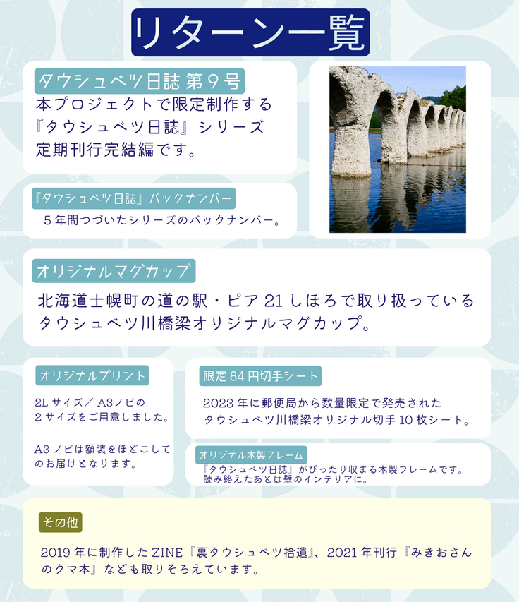 プロジェクト成立後、天災等やむを得ない事情(緊急事態宣言などコロナウイルスによる影響を含む)によりイベントが予定どおり開催できなかった場合でも、展示物・図録を制作いたします。その際には展示は日を改めて開催し、図録は予定通り24年10月中旬に『タウシュベツ日誌 第9号』とともにお届けします。