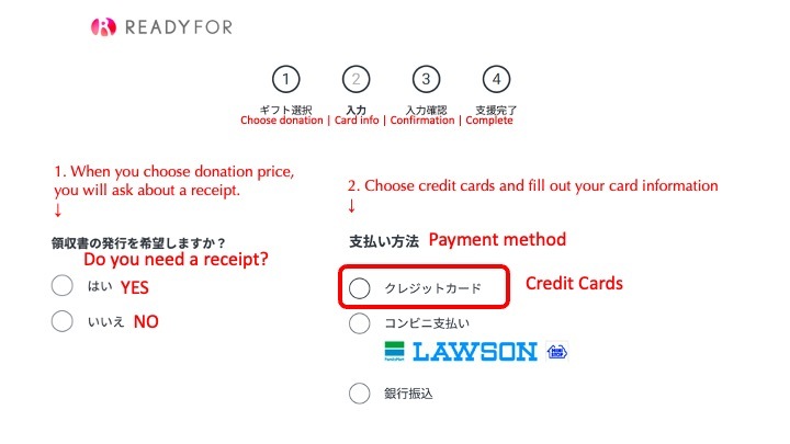 3. After you choose your donation, choose ‘Credit Cards’ as your payment method and fill in your card information, please!