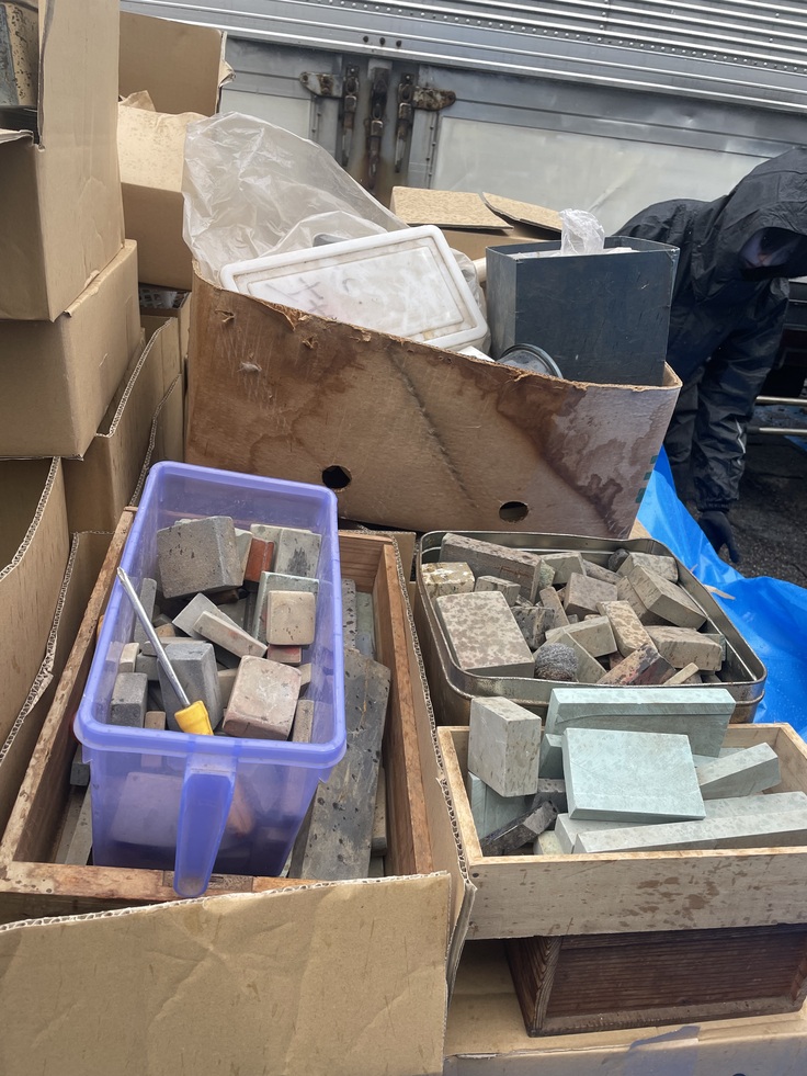 研ぎ石は、目の荒いものから細かいものまでたくさんの種類があり、研ぎ石の使い分けも職人の技術です。写真は、様々な種類の研ぎ石です。無事に運び出されました。