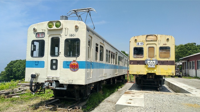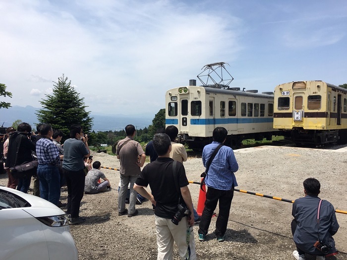 5月27日(土)クラウドファンディングで「お披露目見学会」をリターンに選んでいただいた支援者様へ向けて、群馬県渋川市内の牧場で再会を果たしたデハ1801号とクハ1851号の並んでいる姿をご見学いただきました。