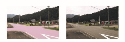 例えばまちに目立つ真っ赤なポスターを竹田の景色―緑色―にしたり、画像のような普段当たり前だと感じている道路まで桜色の道路にしてみるなど、あくまで提案という範囲で自由に色を置き換えてみました。竹田の文化などが感じられる景観になったのではないでしょうか。
