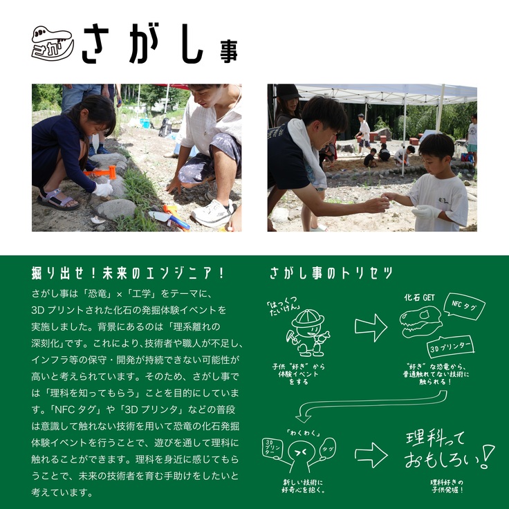 ※1 【さがし事】は工学×恐竜をテーマに活動したプロジェクトで子どもたちに工学への興味を持ってもらうことを目的にしています。3Dプリンターで造形した恐竜の化石を発掘し、スマホをかざすと化石に内臓されたNFCチップから、恐竜の豆知識を知ることができます。発掘体験自体は非常に簡単ですが、念のため保護者の方とご一緒にお楽しみください。