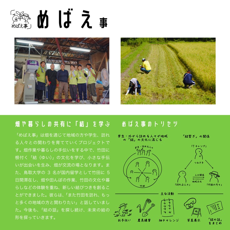 ※1 【めばえ事】は農業×交流をテーマに活動したプロジェクト。日本人メンバー以外での初のディレクター!マレーシア出身のヤーシン君は夏休み約35日間、竹田で合宿をしながら地域住民と農業を通じた交流を行い、そこで出会った「竹田の結の文化」を写真や言葉で表現しました。