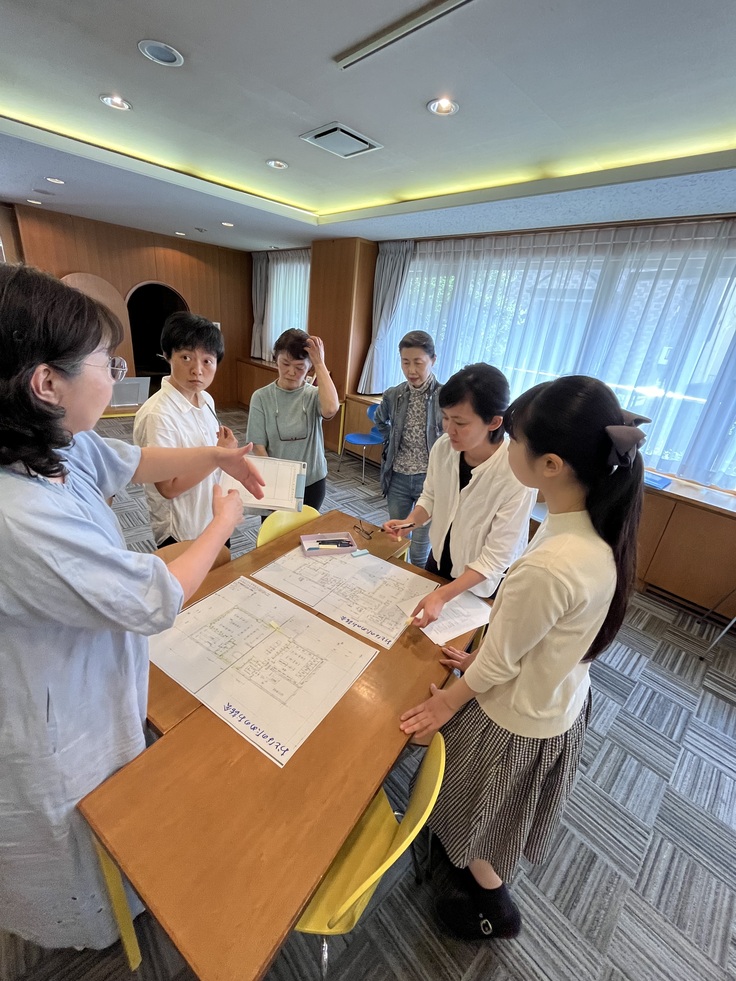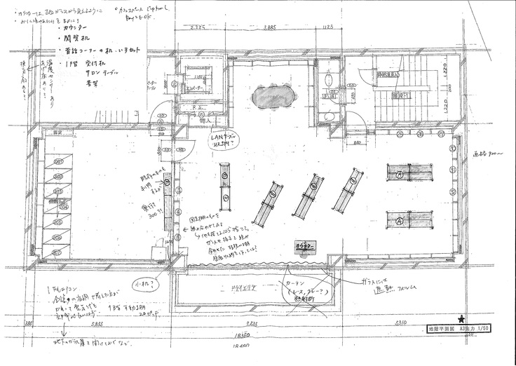 今回のリニューアルに向けての検討も、全員で館内を見て回り「ここをこう使えたらいいよね」「こんな風だったら素敵じゃない?」など、自由に意見を出し合い、アイディアをどんどん図面に書き込んでいきました。