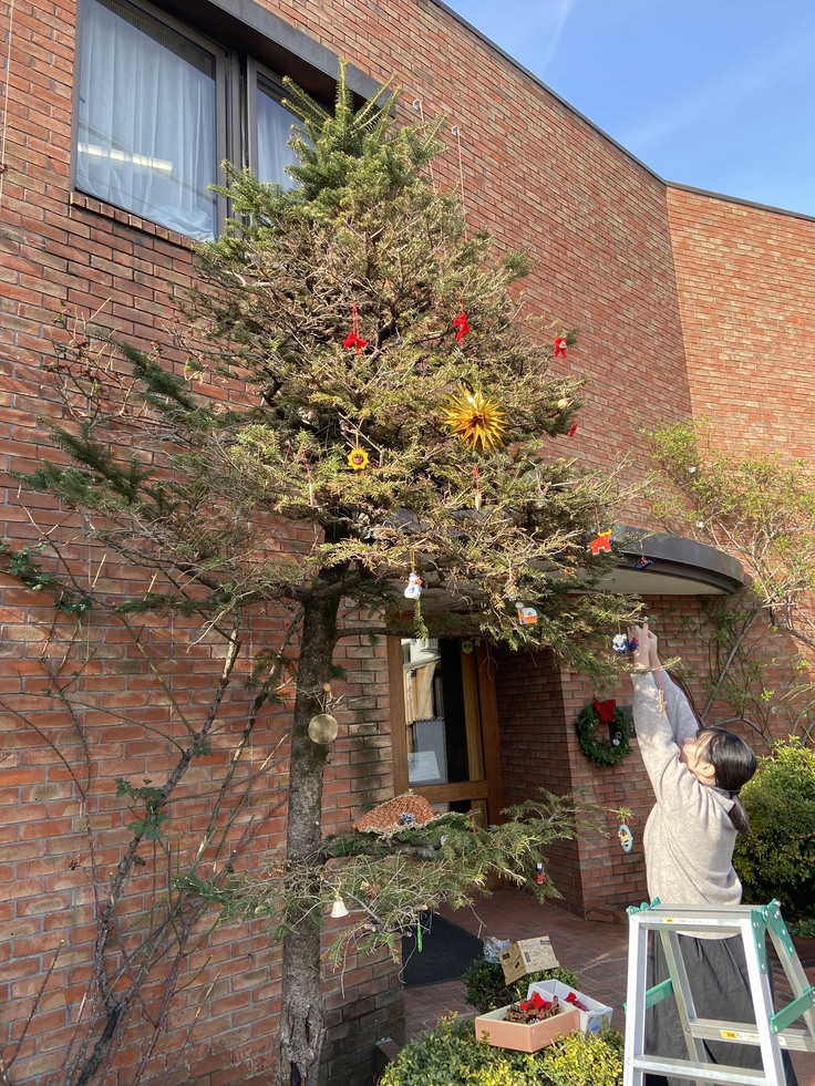 正面入口のモミの木もクリスマス仕様におめかししました。