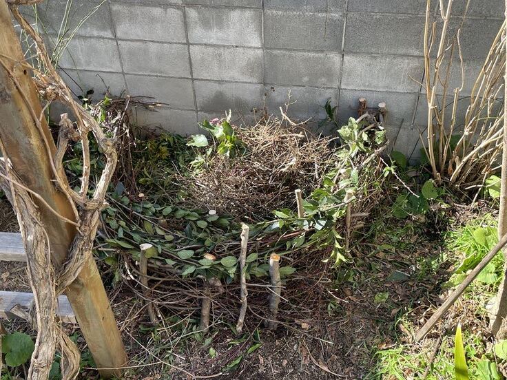 剪定枝を大きな鳥の巣のように組み、その中に枝葉や雑草を積み上げて、ゆっくり堆肥化させていくことができます。