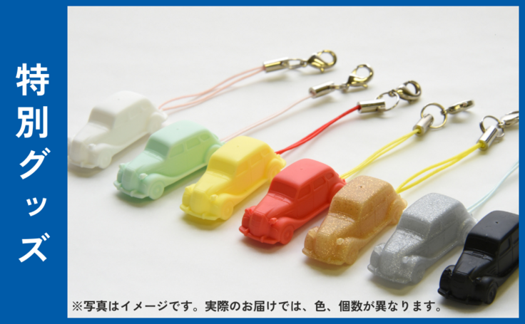 自動車館の電動射出成型機で作ることができるAA型乗用車のストラップ。